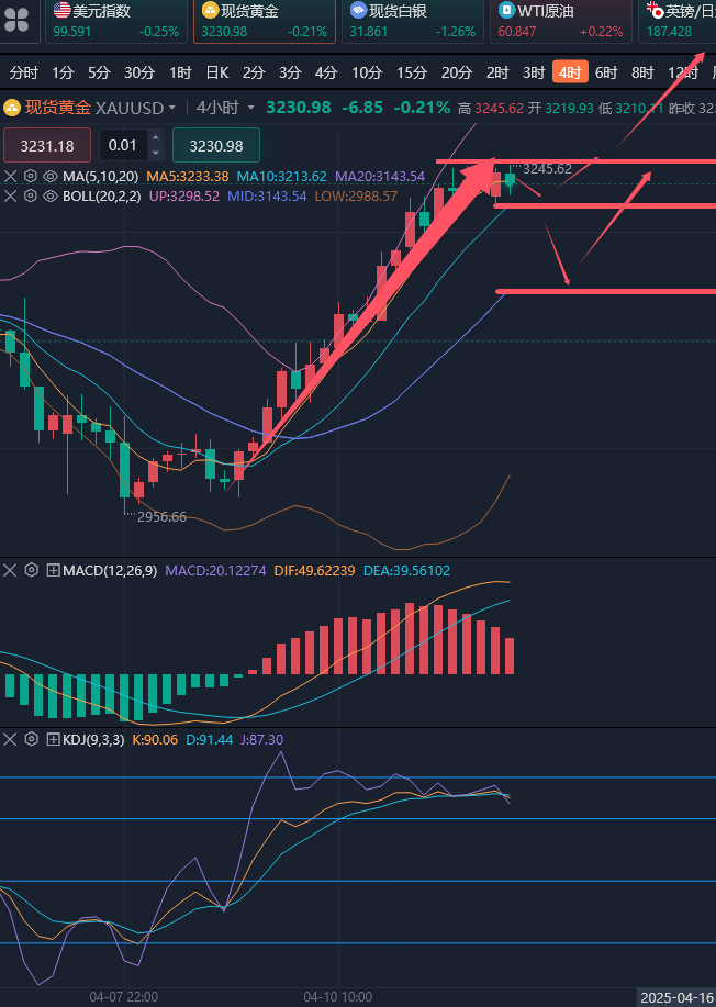 在这个金融市场上,行情变化比起风雨来说,有过之而无不及。我们在分析行情的时候同样会因为一些数据的诱导,致使出现影响主观判断的时候,对于这样大数据行情来说,我们需要做的是能理智应对,面对单子不尽人意的时候,要尽早解决。其实人生处处存在着做人的哲理,弄得变通,思维灵活,为人果敢,坚决,又有什么困难能拦住你走向成功的道路呢? ————————消息面 周一(4月14日)现货黄金小幅低开后窄幅震荡,因美国豁免部分电子产品的关税,金价一度下跌近20美元至3210美元/盎司,但仍受到逢低买盘支撑,目前交投于3225美元/盎司附近。短期来看,黄金上行逻辑依然坚实:贸易战不确定性持续发酵、美元弱势周期开启、美