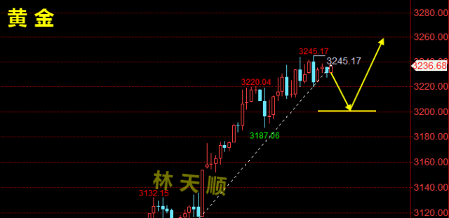上周,现货黄金(XAU/USD)价格再度刷新历史纪录,盘中一度突破3240美元/盎司关口,随后因日线技术指标超买出现小幅回调。尽管如此,整体上黄金仍受到强劲支撑,维持强势整理格局。 今日早间高开低走,亚盘时段一度再次刺穿了高点来到了3245.54附近,黄金市场还是在不断地刷新着记录,似乎有一个使不完的劲不断地支撑着上涨.从目前的盘面上来看上方短暂的阻力关注一小时布林带上轨3242和日内高点和一小时SAR指标处3245区间,向上偏差关注3250-3260区间.更上方关注3280-3290,下方支撑短期留意四小时SAR指标处3215一线,向下偏差留意3200关口和日线MA5均线3190区间,更下
