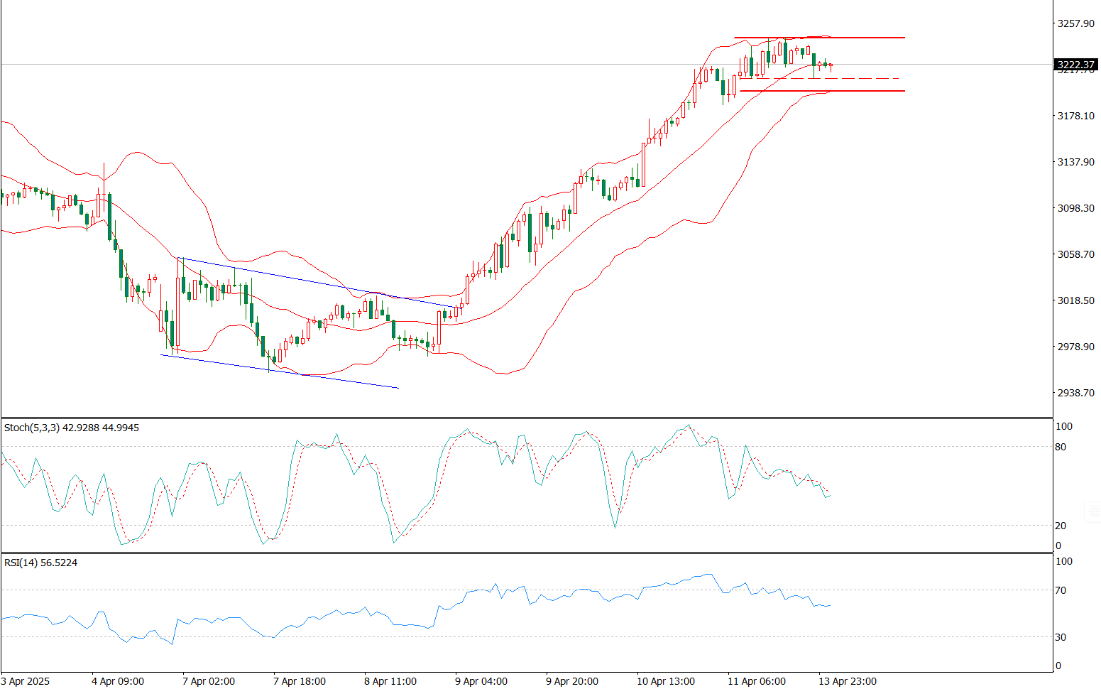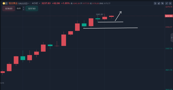 近期全球金融市场波动加剧,美古在短暂反弹后承压下挫,即便有暂停部分国家关税的利好消息,也未能缓解市场恐慌情绪。美元指数连续两日大幅下跌,跌破100关口,刷新自2023年7月以来的新低,反映出市场对全球经济前景的担忧。美债市场同样不平静,30年期国债收益率突破4.95%,创下1982年以来的最大周涨幅,这背后是市场对长期通胀预期的上升以及货币政策不确定性的增加。 金作为避险资产,价格持续飙升,显示出大家对风险资产的规避态度。关税战带来的市场冲击显著,价格波动完全受情绪主导,目前避险情绪浓厚。黄金四小时级别,这波上涨极其强势,一路攀涨没有回调,现在越过上周高点后站稳3200上方,技术指标方面金叉