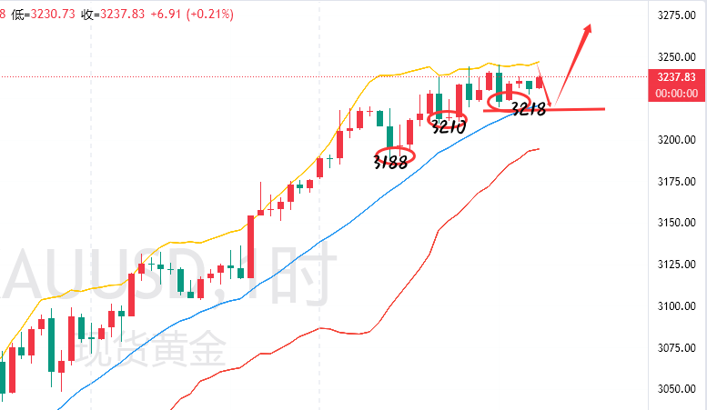 黄金开盘行情预测: 周五(4月11日)中国财政部宣布对美国商品加征125%的关税,以回应特朗普总统前一天将中国进口商品关税提高到145%的决定。由于美元走软以及对贸易战加剧引发的经济担忧,避险资产黄金周五首次突破关键的3200美元关口。尽管市场一度出现技术性回调,黄金一度回撤至3200下方至3187附近,但很快再度受到逢低买盘支撑,目前停盘于3237美元附近,暗示这场世纪行情的底层逻辑坚若磐石。黄金日线收红三兵,上方无实质性压力。1小时周期上升浪形延升,均线多头发散,下周大概率继续上涨,短期可关注关注3220美元,破位下看3205美元附近支撑;上方短期关注3255美元,破位上看3282美元附
