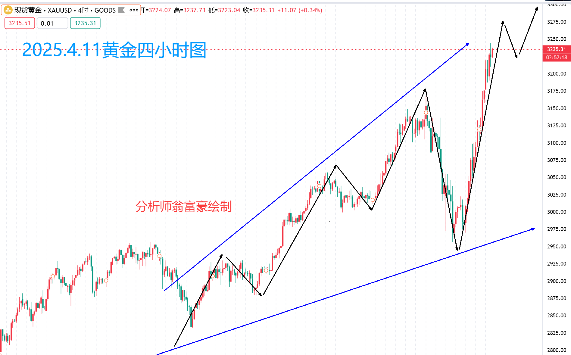 高晓峰:4.11本周五黄金或迎剧烈波动,冲高回落风险加剧! 想必又有很多套空单多单的客户,想必又是彻夜难眠,俗话说,授人鱼不如授人以渔,那么你为何不多学习一下老师的看盘思路,多去了解一下老师的做单思路,老师的分析理念呢。我觉得这样的投资朋友,就在用心在投资,没有拿自己的血汗钱来看玩笑,我相信这样的投资朋友,最终在投资的路上也会有一个比较好的结果。好了,不多说,先给大家分析分析目前的行情。 黄金消息面: 周五(4月11日)美盘,黄金冲高至历史纪录3244.15单周涨幅近3%,三日累计暴涨超200美元。核心推动力来自美国贸易政策的反复无常:特朗普****宣布暂停对部分贸易伙伴加征关税90天,但现