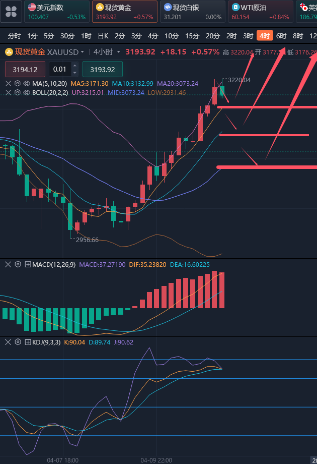张津镭:特朗普关税战+美元崩盘,黄金火箭式看涨 昨日黄金继续走了一个大涨行情,亚盘开盘涨幅不少,不过欧盘有所回落,但给的3110多单再度完美进场,随后金价一路高走,美盘不断刷新历史新高,多单直接止盈于3160一线,大赚50美金,两日连赚百余美金,真的赚的盆满钵满。最终金价是收盘于3175美元,日线收于一根大阳线。 周五(4月11日)今天又是见证历史的一天!现货黄金价格就像坐上了马斯克的SpaceX火箭,一路冲破3200美元大关。这波行情让空头们哭晕在厕所,而多头们则忙着数钱数到手抽筋。主要还是夜里美元指数隔夜大跌超2%,直接跌到100关口附近,美债收益率也跟着跳水。美元越惨,黄金越嗨! 可以