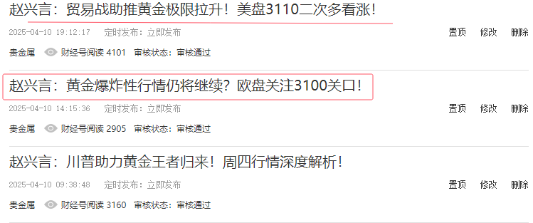 在交易的世界里,很多人觉得要不断的行动、交易才能抓住机会,其实,学会等待才是一种明智的策略。市场就像一片大海,波涛汹涌,变换莫测。那些频繁交易、盲目跟风的人,往往容易被浪潮淹没。而等待,是在退潮时耐心观察,寻找海底隐藏的宝藏。 4.11黄金分析 金价周四大涨近3%,创下纪录新高,美元下跌和贸易战升级推动投资者奔向避险黄金。技术面金价再次向上破位整数关口,市场看涨情绪急剧升温,日内短线倾向于看涨延续,不过考虑到目前走势全部依赖消息面,稳健暂时观望。 4.11原油分析 油价周四收盘每桶下跌超过2美元,因投资者重新评估了美国暂停征收全面关税的计划。技术面虽然油价短线在低位出现了一波较强的拉升,但是