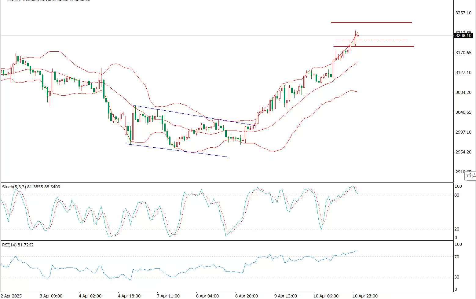 张尧浠:美CPI爆冷美元空头加强、金价年内前景仍剑指3500 上交易日周四(4月10日):国际黄金再度大幅反弹收阳,突破扩展线阻力,并进一步刷新历史高点收涨,多头力量增强,也暗示走势将继续保持牛市上行,等待更高的目标触及。 具体走势上,金价自 亚市开于3083.37美元/盎司, 即短暂走低录得 日内低点3071.34美元 ,之后则再度走强,虽于午间遇阻3130美元附近表现回撤,但仍保持着1小时及4小时的反弹趋势,并继续回踩支持后再度走强,一路延续到美盘尾盘触及 日内高点3175.93美元 ,最终持稳 收于3174.99美元 , 日振幅104.59美元,收涨91.72美元,涨幅2.97%。 影