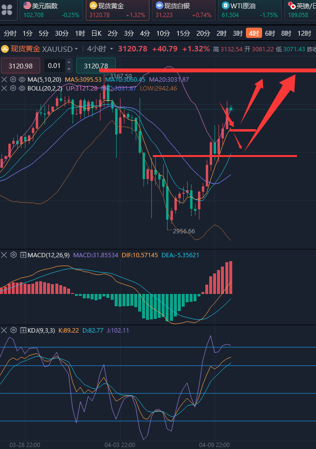 市场的波动永不停息,不用担心没有挽回损失的机会,交易市场的钱永远挣不完。如果此时一意孤行,为了弥补亏损而不肯罢手,很可能招致更大的损失。因为此时你操作的态度已乱,失去了冷静观察市场的能力。正所谓当局者迷,旁观者清,退步抽身,重新审视市场的变化,才是在此获得判断市场行情走势能力的上上选择。 ————————消息面 周四(4月10日)现货黄金短线走高,目前交投于3122美元/盎司。现货黄金周三上演"暴力拉升",单日暴涨超3%创2020年3月以来最大涨幅,盘中直逼3100美元大关。这场史诗级行情背后,是特朗普****对亚洲大国关税骤升至125%的决策——市场恐慌指数瞬间爆表,投资者一度疯狂抛售股票