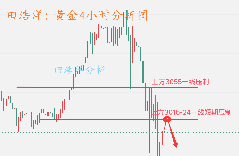 昨日黄金技术面在震荡交投中延续压制回落震荡下行破底收盘,亚欧盘价格小幅反弹回升走强,午后欧盘接连向上冲高刺破3020关口陷入横盘震荡整理,晚间美盘二次冲高3022关口压制回落震荡下行跌破欧盘起涨点2980关口并延续下行至2970附近报收冲高回落长上影十字K,整体金价在3020关口出现二次承压遇阻形态,昨天我们多次的空单都是完美介入,关注田浩洋的朋友都是可以看到,短期彻底进入到空头调整下行节奏中,如果你目前黄金操作不理想,希望田浩洋能让你的投资少走弯路,欢迎前来沟通交流! 从4小时分析来看,今日上方阻力短期关注3024-28一线附近,日内反抽依托此位置继续主空顺势下看回落不变,下方目标位继续看