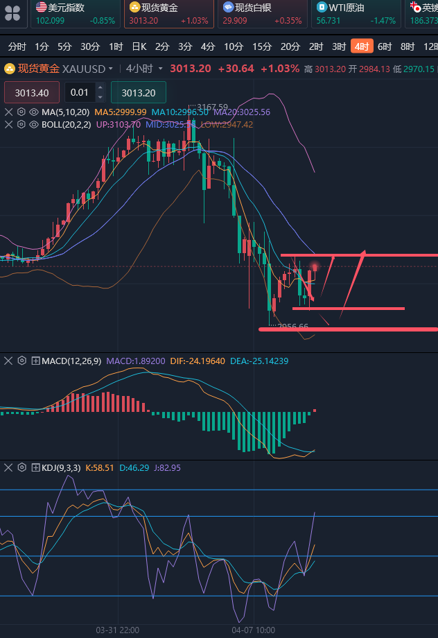 此刻看文章的朋友,别急着看分析!更不要急着看建议!我趋势看的再对,点位看的再准,做不好的话也是白看,行情机会多得是,朋友你如果操作过程中的思路、理念和手法就是存在问题的,点位抓不好,止损不带,恣意扛单,仓位管理不好,存在这些问题的话,再好的行情又有什么意义呢?所以要想改变口袋,就必须先改变脑袋。江沐洋希望各位如果有上述的问题,能及时反思,在错误的道路上止步,这,就是进步了。只有控制住风险才能看到利润,不然很可能会被好行情戏耍! 周三(4月9日)亚市早盘,现货黄金维持窄幅震荡,交投于2981美元附近。前一交易日,金价反弹受阻,盘中一度冲高至3022美元,但受美债收益率攀升及美股下跌拖累,最终回