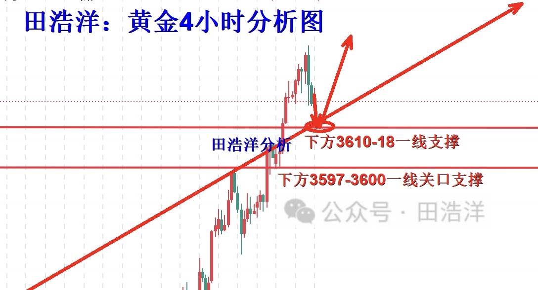 昨日黄金技术面先扬后抑,整体金价在亚欧盘延续多头强势上行加速冲高,最终在晚间回落陷入震荡反复,最终收盘在3628一线,日k线报收冲高回落震荡中阴,昨天就一直通知大家技术面需要回踩,不要过分看涨黄金,现在一切都是完美符合预期,关注我的朋友都是可以看到的,今天我们继续以回踩做多的思路进行对待,毕竟本人田浩洋认为趋势依旧没有反转,回踩做多依旧是大势所趋,今天调整我们先关注下方3610-17一线短期支撑,回踩不破继续做多。如果你目前操作不理想,希望田浩洋能让你的投资少走弯路,欢迎前来沟通交流! 从4小时分析来看,今日下方短期支撑关注3610-17一线附近,短期多头强势分界线上移至3597-3600一
