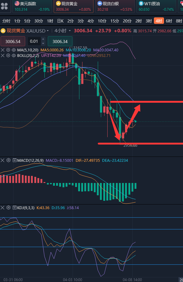 很多投资者在投资上总是觉得自己天赋异禀,总是想要展现出自己的“聪明才智”,当市场行情大涨的时候,他总是觉的要到达压力位,当市场低迷的时候,他却总是觉得行情马上要上涨,这样的对市场没有根据的“自信”往往就会使投资陷入一种没有依据的瞎猜之中,最后的结果想必也不会太好。因此在投资中,一定要顺应市场的形势进行操作,在一些特殊的反转点可以有自己的想法,但是也一定要在市场的趋势下进行操作,才会有好的结局。 ————————消息面 今日周二(4月8日)现货黄金重回3000关口,目前金价暂报3004美元/盎司,在美国全面征收关税引发全球经济衰退的担忧之后,投资者转而将美元作为避风港。不过,鉴于经济形势严峻,