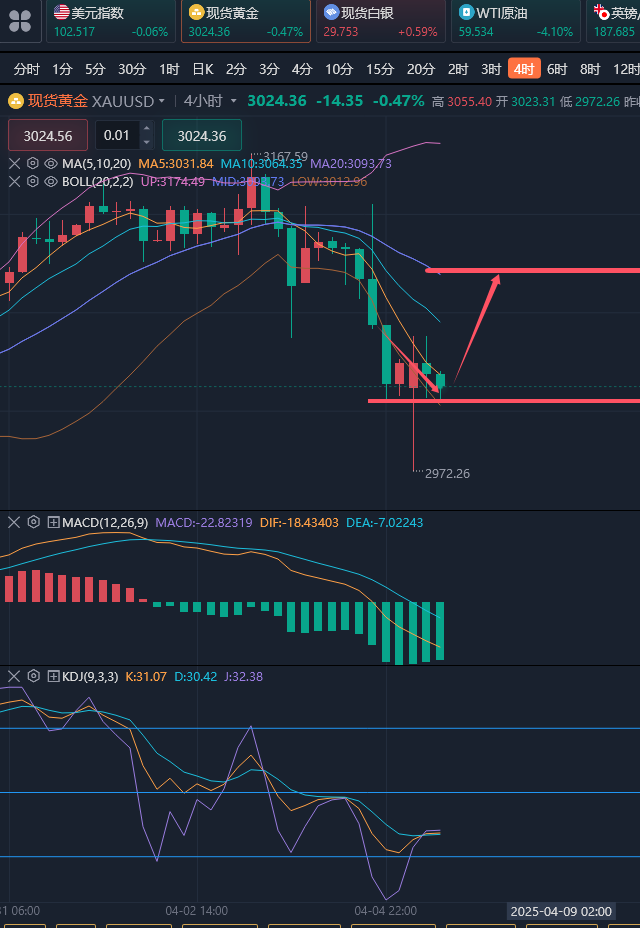 每一次的相遇,结实到相知都不容易,茫茫金市中,能够遇到就是缘分,无论是哪位朋友,江沐洋在这里承诺,有问必答,有求必应,江沐洋有可能做不到百分百正确,但是我知道这个市场就是在做大概率事件,只要我们能够稳定盈利,那么结果至少还是很好的,也感谢大家的信任,近期继续布局波段,一定严格按照策略,经得起诱惑,守得住繁华,把利润无限放大,金海浮沉,江沐洋与你同行! 现货黄金: 周一(4月7日)亚市早盘,现货黄金延续跌势,因国际贸易担忧情绪升温,全球股市崩盘,投资者继续抛售黄金以弥补他们在更广泛的市场崩溃中的损失。一度失守3000整数关口,刷新3月13日以来低点至2970.57美元/盎司,自前期3167开始