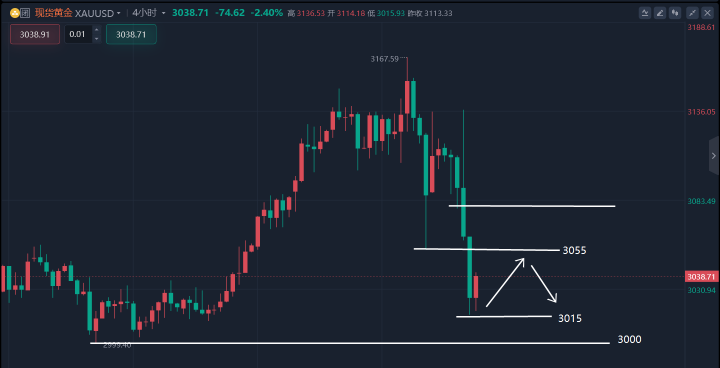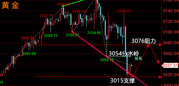 黄金: 黄金大趋势分析:本周的这一轮超级过山车算得上今年最大一次行情了,日线黄金级别单日跌幅达121美元,技术面上直接将近期形成的多头趋势打乱了;黄金周线来看,黄金的周线收取了一根带上影线较长的大阴线,本周黄金最高触及到3167,最低回落至昨日低点3015美元,单周跌幅达到152美元,对于这样的收线形态来看,黄金下周大概率要呈现宽幅震荡的修复形态了,从月线级别的形态来说,黄金的长期牛市并未结束,等待震荡过后依旧还是看好黄金在2025年再创新高。 黄金暴跌后趋势分析:黄金日线行情来看,昨天的大阴线直接致使日线MACD呈现死叉往下,日线是呈现两连阴的形态,周四周五的下挫力度比较大,下周整体的节奏