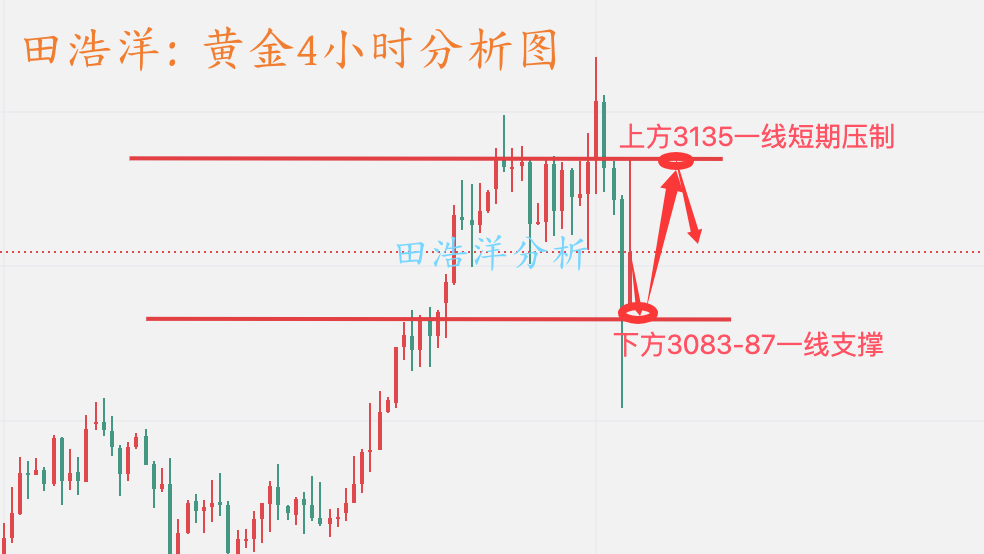 黄金小时均线还是有向下拐头的迹象,昨晚黄金美盘的拉升,没有让黄金小时均线进入死叉形态,黄金多头虽然强势反抽,也是因为避险消息刺激报复性的反弹,不过黄金冲高之后继续回落,黄金开始回归震荡,今天晚间有非农数据,非农数据的影响预计会黯淡失色。更重要的还是消息的刺激。如果你目前黄金操作不理想,希望田浩洋能让你的投资少走弯路,欢迎前来沟通交流! 从4小时分析来看,上方关注3130-35一线短期压制,下方支撑关注3083-3087一线支撑,企稳此位置上方继续保持顺势低多节奏,回踩做多思路坚持不变,顺势做多拿住多头空间,尽量不要逆势操作。具体操作策略我会在盘中提示,及时关注。 黄金操作策略: 1、黄金回踩