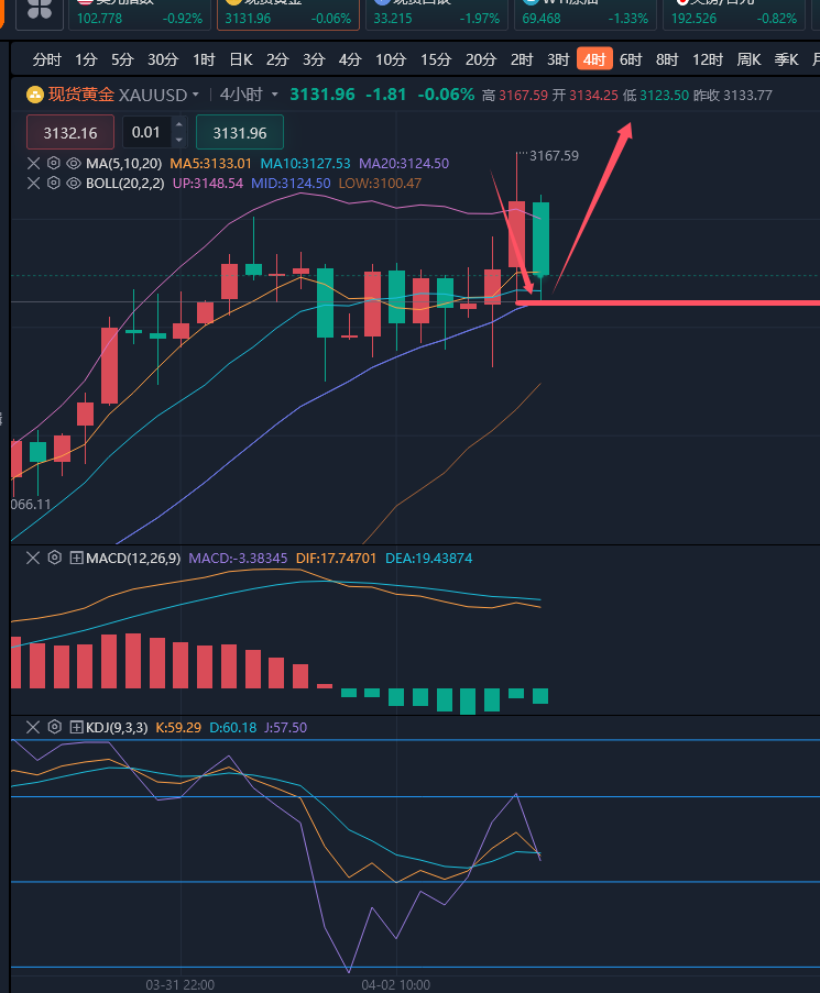 一觉醒来,黄金又新高了!回顾过去一年,国际金价涨幅超500美元,国内金价每克上涨100多元,如此强劲的走势在贵金属市场历史上也实属罕见。在过去三个多月里,我们始终坚持一个方向——只多不空,只买不卖。即便早间金价再创历史新高,我们依旧坚信高点之上还有高点,日内操作仍建议做多为主,看向更高价位。 市场瞩目消息落地,川普在白宫宣布对贸易伙伴征收所谓的“对等关税”措施,他表示,美国将对所有进口商品征收10%的全面关税,将对其他被认为在贸易中表现不佳的国家征收更高的税率。随之市场也作出了激烈的反应,黄金,白银出现先跌后涨的走势,其中,黄金在周三连续试探下行不破3105后再次走高,并且刷新高点至3168