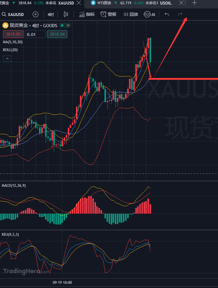 黄金实时行情分析:本身是非农数据周,我以为会出现周一单边上涨,周二单边下跌的情况,没料到黄金跟踏马吃春-药一样,蹭蹭的往上串,不可避免的早盘提示的3848挂空单被扫单了。12点收线后,再次给出3865空单,以4小时布林带上轨3867压力点看回撤修复指标。 这几天一直在说9月末看跌,今天已经到了月末最后一天,我真是不相信黄金还会涨到哪里去,给我的感觉就和****线程序一样,每天涨几十个点,高位追多我自己都会恐慌,但是我每次参考阻力节点防守做空同样也拿到了利润。临近国庆,要回老家吃几天酒席,有空我会简单说说方向和点位,不会影响做单。 今日阻力方面关注3867,向上突破看2小时布林带上轨3875一