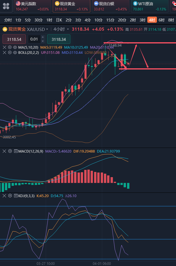 交易就是一场修行,修行的目标是为了明心见性;明心见性后,并不意味着我们获得了某种超能力,而是更加的了解了自己、了解了交易的真谛,找到合适自己的方法,坦然接受交易中的不完美,不与市场对抗,将交易中的大亏避免掉,自然就能稳定盈利了。 ————————消息面 周三(4月2日)现货黄金窄幅震荡,目前交投于3117美元/盎司附近。金价周二金价冲高回落,一度刷新历史高点至3148.85美元/盎司,但随后因获利回吐而有所回落,收报3114.03美元/盎司,跌幅约0.3%。美国总统特朗普计划在4月2日宣布对与美国存在贸易不平衡的国家征收全面关税,这催生了大量避险买盘,帮助金价持续走高,但临近最后时刻,部分多