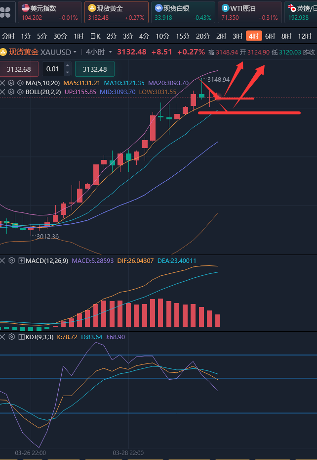 周二(4月1日),贵金属市场延续强势,现货黄金价格再创历史新高,突破3148.85美元关口。分析师认为,这一涨势由美国即将实施的关税政策及全球经济不确定性推动,市场避险情绪持续升温。然而,技术面指标已全面进入超买区域,短线或面临回调风险。 从黄金1小时图看,上涨放量尾端,浪形尾部的放量上涨通常持续性不强,伴随一步一回头的洗盘走法,昨日回撤后,今日早盘快涨冲高,伴随一根小时图的大阴线回撤修正,以3150局部高点进行回踩,波动基数大调整空间可大可小,目前位置追高不好追。虽说做空是逆势而为,但技术面超买关税实施也将兑现,调整的空间也不可小瞧,以超短线结合中长线空来应对短空调整。综合来看,今日黄金短