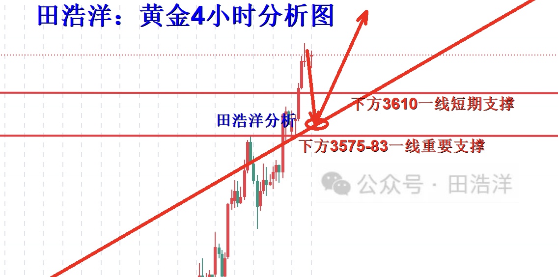 昨日黄金技术面在亚盘快速回踩下探企稳3580关口迎来多头强势拉升走强,午后欧盘进一步高举高打延续多头极强单边上涨,并一举加速冲高刺破3646关口强势收盘,日k线报收强势破高中阳,日线级别连阳强势拉升形成多头极强单边上涨形态,凌晨最高触及3646.3一线,今天开盘黄金震荡,技术面有回踩修复的迹象,虽然大趋势依旧看多,但是不能排除短期技术面回踩调整的情况,本人田浩洋认为近期连阳的崛起目前技术面需要进行一定的调整需求,所以我们不要过分看涨黄金,特别是3650一线上方不要追多,一定要警惕技术面的回踩需求。如果你目前操作不理想,希望田浩洋能让你的投资少走弯路,欢迎前来沟通交流! 从4小时分析来看,今日