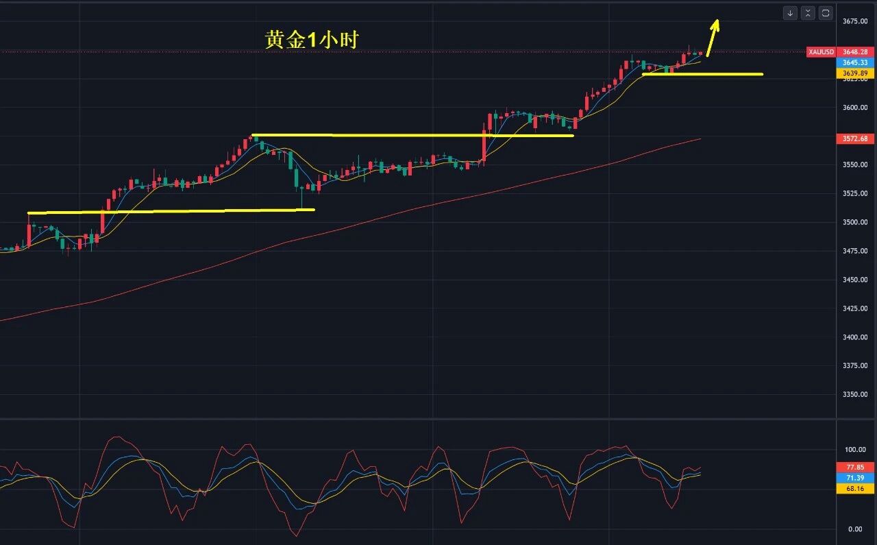 黄金已经强调了无数次,趋势为王,如此简单的原则,仍然有人不信邪!侥幸抄顶,只会被按在地上摩擦!看似是展现高超的技术,实则是还没有入门!唯有顺势,才是翻倍的不二法门!在强大的市场面前,我们都是微不足道的,犹如沧海一粟。尊重市场,放弃对抗思维,一切都应以市场的变化而变化,不应该把个人意志强加给市场。市场是不考虑任何人的感受的,它有其自身运行的方式和规律,顺从它了,就奖励你;忤逆它了,就惩罚你。 消息面: 黄金周一首次突破每盎司3600美元的水平,创下历史新高,因疲软的美国劳动力市场数据强化了美联储下周降息的预期。现货金上涨1.3%,至每盎司3634.25美元。金价盘中创下3646.29美元的历史
