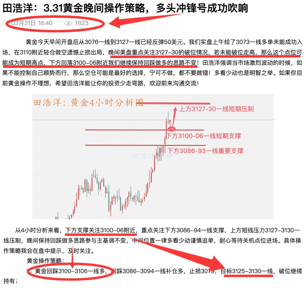 黄金早盘开盘冲刺突破3130一线,我们实盘直接顺势做多,截止目前已经到达目标3140-3145一线,昨日黄金技术面在亚盘即迎来加速拉升,午后欧盘多头接力上行突破并站上3100点整数关口到达3120上方延续强势震荡,晚间美盘二次回踩确认企稳3100关口并进一步延续冲高刺破3127关口强势收盘,关注我的朋友都可以看到,我们实盘和昨晚美盘前文章分析也是成功在3100一线多单进场,这也是验证了昨晚本人文章给出的3127-3130一线压制,日K线报收震荡破高中阳,整体金价在突破3050关口后迎来多头加速上涨节奏,日线级别连续三个交易日以强势中阳收盘,如果你目前黄金操作不理想,希望田浩洋能让你的投资少走