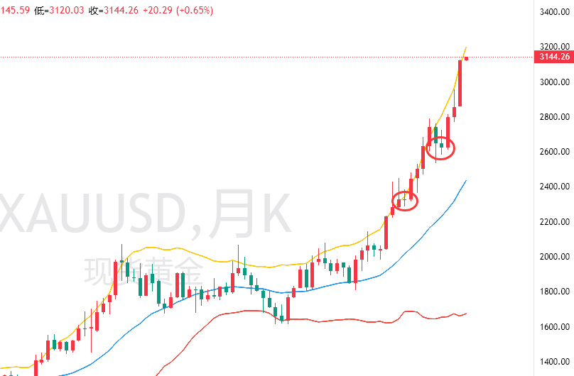 3月收官,黄金几乎收在最高点,技术形态上是光头光脚的大阳线,最低2855,最高3128,上下达到273美金,这个空间打破了前面单月差不多在上下200美金的幅度,说明当前是牛市的加速阶段,属于大幅放量上冲,力度、幅度都非常犀利,势必要把空头全部绞杀殆尽。 从今年年初在2600的时候,就明确讲过基本面还是站在多头这边,这个是市场运行的底层逻辑,技术图表,乃至价格只是来反应这一段趋势的运行过程,转势的前提必须是基本面发生重大的改变,否则不会扭转,回望历史,很多人认为价格高了,但记住这只是相对的,长期来说中枢一直是在抬高,随着以年为单位来计算,黄金是长期的世纪牛市,有回调,但未来必定是更高,这个是宏