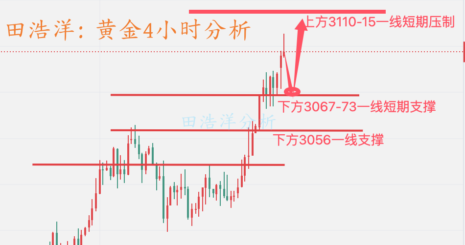 黄金上周五技术面延续多头强势上行破高收盘,美盘金价企稳3067关口继续发力上行,最终收盘重回3085上方以几乎日内最高点收盘,日K线报收震荡破高两连阳,整体金价强势站稳3050关口上方延续多头极强单边节奏,不过今日开盘后金价延续加速冲高刺破3097关口承压回落迅速走跌调整,短期金价在3100整数关口有望迎来多空震荡反复,目前3100附近勿追多,虽然开盘反弹3097附近回踩调整最低触及3077一线后反弹,但是这波技术面调整远未达到目标,我们继续保持回踩做多的思路不变!如果你目前黄金操作不理想,希望田浩洋能让你的投资少走弯路,欢迎前来沟通交流! 从4小时分析来看,下方支撑关注3065-73附近,