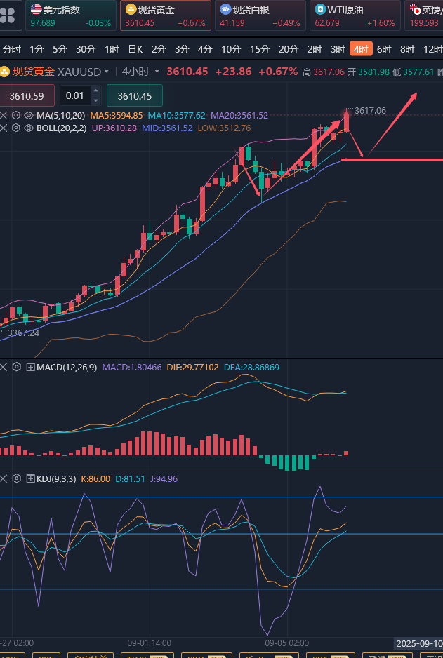 大行情抓不住,小区间拿不准,一直在扫损!相信很多者朋友都遇到过的问题,那么问题的症结出在哪里?原因很简单,因为你做单没有章法、不懂理性,总是在追涨杀跌,凭感觉做单,小赚即出,大亏却一个不漏!当你拿着大把的本金进入这个市场,你本来有大赚一笔的资本,但却将一把好牌打的稀巴烂。做单,首先看趋势,其次看点位!有理由的操作,无论对错及时检讨,这才是投资! ————————消息面 今日周一(9月8日)非农数据的疲软使得市场对9月降息的概率升至98%,年内累计降息幅度预期扩大至50个基点。降息预期降低了持有非孳息资产黄金的机会成本,同时削弱了美元资产的吸引力,推动黄金价格突破3600美元/盎司大关,截至目