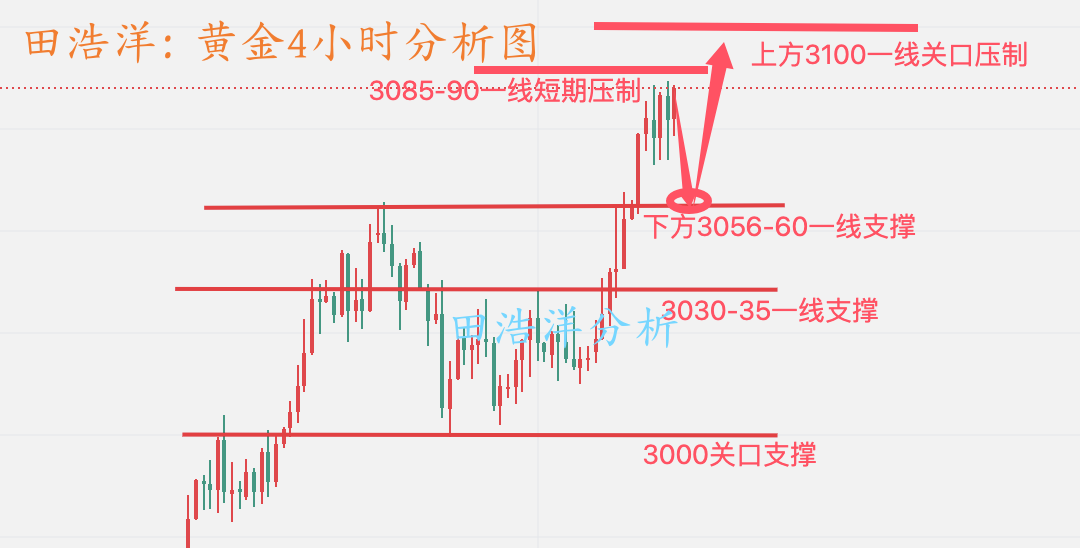 本周我们一直强调回踩找机会做多,相信关注我的朋友都可以看到,周一我们开盘给了3000-05一线做多,周二至周三回踩3008附近做多,周四我们给了3030-35一线多,周五黄金多次强调高位不要追多,上方依旧没有突破3085-90一线短期压制,周五整个行情基本在上午波动大,开盘直接冲刺成功站稳了3070一线上方,本周依旧收阳线,收盘在3080一线上方,下周我们继续以回踩做多为主,但是千万不要追多,毕竟技术面需要回踩调整,回踩做多才是顺势之道,如果你目前黄金操作不理想,希望田浩洋能让你的投资少走弯路,欢迎前来沟通交流! 从4小时走势来看,上方短期阻力关注3085-90一线附近,重点关注3100关口