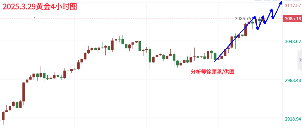 周五晚间美国2月核心PCE物价指数超预期,数据本应利空金价,但金价却屹立不倒强势上涨,技术面关税风波及地缘局势共同为金价筑起坚实支撑,推动买盘力量持续涌入,金价本周再创新高。自周四早盘3017涨至周五最高3086,涨幅近70美金,单边上涨趋势明显。 周五金价在3086-3066间震荡,但未见顶象。当前黄金市场多头趋势依旧,下周有望再攀新高。周四早盘已提示趋势要转为多头,周四周五连续上涨也符合我们的预期。目前金价收盘于3085附近,下周一需警惕高开低开风险。上方阻力位于3090-3094,若站稳将测试3111位置,下方支撑在3077-3074。操作上徐顾承建议下周一回调做多为主,反弹高空为辅。
