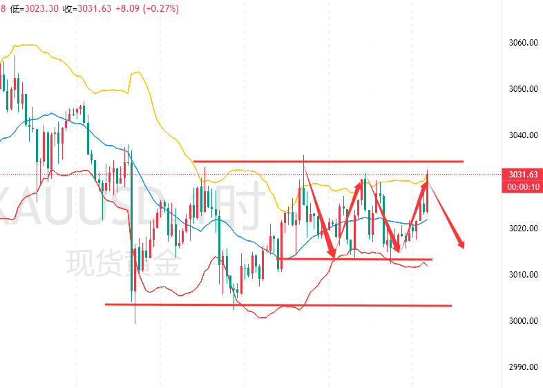 投资这座山,原本没有顶、没有头。不要站在旁边羡慕他人成功,其实成功一直都在你身边。聪明的人,一味向前看,智慧人,事事向后看;聪明人,是战胜别人的人;智慧人,是战胜自己的人。修心要当以净心为要,投资要当用慧眼远眺。每日都是新的一天,都是挑战的开始。 黄金技术面分析:4小时级别的走势,黄金价格就像被框在了3010到3030这个大箱子里,上不去也下不来,要是能一鼓作气突破3038这个关键点位,黄金今天可能就要来波强势上涨。但万一失守了3000这个心理关口,那可就要回踩2971到2997这个支撑带。 所以,今天的黄金操作,我建议大家稳扎稳打,回调就做多,反弹就做空。重点关注3030到3036这个阻力