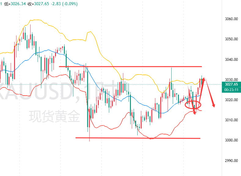 黄金还会继续上涨吗,接下来是继续震荡,还是破位下跌呢? 不管近期的行情反复震荡,还是洗盘,我们也是一直秉承着多看的的思路不变。整体有一个不错的收益。 昨天,黄金延续震荡上行趋势。美盘时段,消费者信心数据出炉后,现货黄金价格短线大幅飙升,最高触及3035美元。随后,金价回吐部分涨幅,但周二仍收于3020美元附近。 今天是重要时间节点。在经历前两日的震荡后,黄金大概率会在今日选择方向。本周,黄金一直在3000-3030美元区间震荡,不过我认为,今天有望突破这一区间,且大概率继续向上破位。 我们从小时图来看,本周黄金第一波上涨从3000美元涨至3033美元,涨幅33美元;第二波则从3002美元涨至