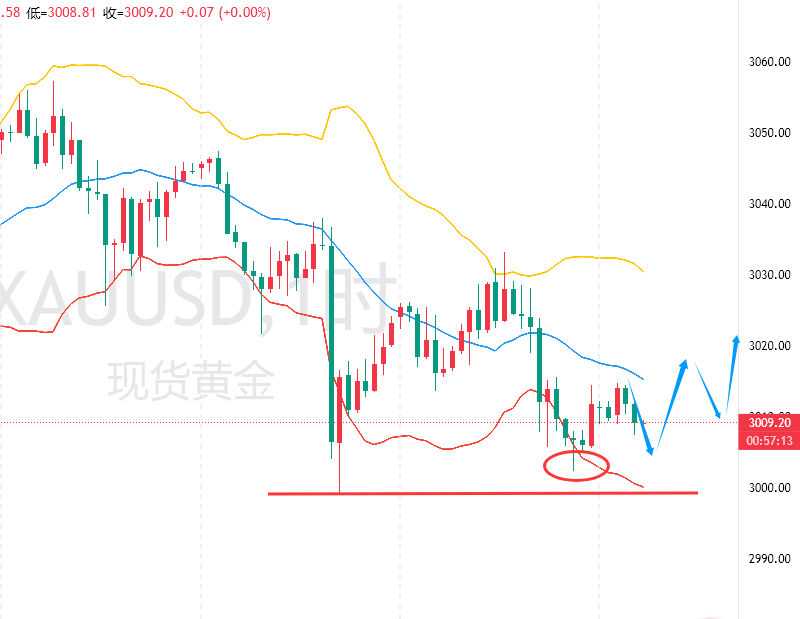 黄金3000能否破位?行情趋势是否转空?今日黄金又该如何看待? 黄金在上周尾从3057—3000下跌57美金,昨日震荡下行,日线收阴价格触及短期均线。从多头修正的角度来说调整还没有到位,仍有进一步下跌的可能,3000关口破位的概率很大。 但是当前行情又进入震荡之中,多头延续性很差,昨日日内震荡上行,晚间十点后才开始下跌,凌晨低位收盘,整体还是一个震荡走势。今日早间探底回升,价格突破凌晨凌晨高点3014,但是不建议盲目去追,重点看欧盘走势,如果欧盘上去了晚间就以震荡看待,上方压力在3035—3038触及可以空一下。 但是如果欧盘走跌,下破3007那么今日就是一个
