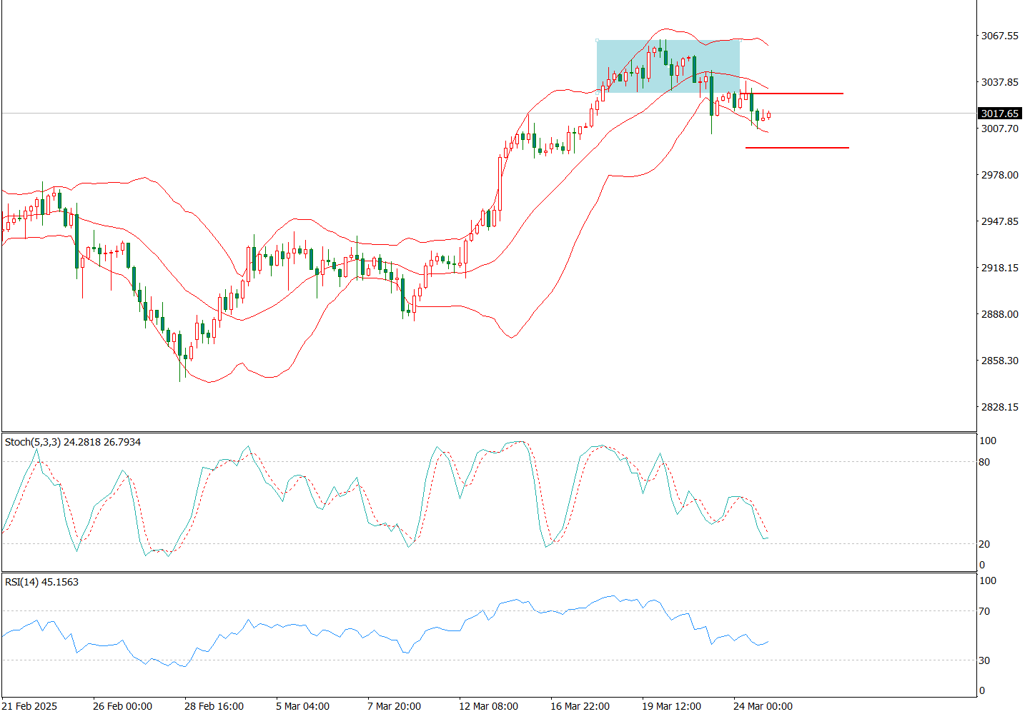 周一(3月24日),投资者则对特朗普在对贸易伙伴征收关税方面更加谨慎的立场进行了评估。随着美元触及两周多来的高点,金价连续第三个交易日下跌。 避险方面,如果本周在沙特阿拉伯的谈判确实实现,并且黄金价格下跌,我预计黄金将很快被买入。由于这些不确定性没有明确的解决方案,(黄金)需求预计在短期内将保持高位。 黄金策略操作回顾 策略提示第一单3026空单,止盈3013一线! 策略提示第二单3028空单,止盈3020一线! 策略提示第三单3032空单,止盈3023一线! 对于今天黄金走势的看法 黄金方面,已经连续三日走了回撤,这在前期疯狂连阳上涨的情况来看是有些特殊的,通常,日线连阳中的阴线,只要是欧