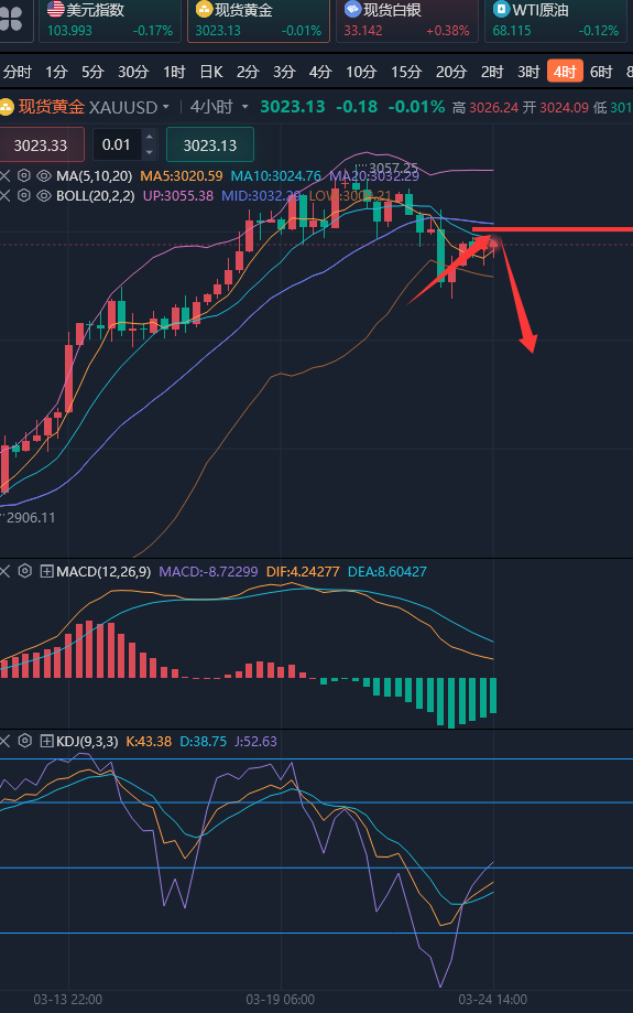 交易的过程是一个逐渐成长的过程,对风险认知的加深是一个投资人不断成熟的标志。而当一个投资人对风险有了正确的认知,又能以正确的心态去执行,很好的去规避风险,就是一个成功的投资人。 ————————消息面 周一(3月24日)现货黄金窄幅震荡,目前交投于3021美元/盎司。金价上周五下跌0.7%,因美元走强和获利回吐,盘中一度触及3000整数关口,不过地缘政治和经济的不确定性挥之不去,加上美联储降息预期,金价仍受到逢低买盘和避险买盘支撑,上周五金价收报3023.04美元/盎司附近,周线上涨1.17%,为连续第三周上涨。 原油价格目前交投于68.1美元/桶附近。上周,OPEC+公布的最新计划要求七个