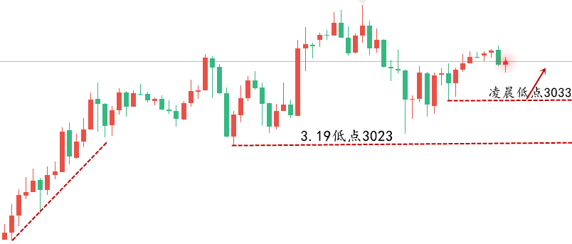 乐观的人看世界,处处充满阳光;悲观的人看人生,总是灰暗一片。什么样的心态,就会造就什么样的命运。 保持积极向上、乐观豁达的心态,才能有力量面对困难。人生也是这样,心持正念,积极乐观,无论面对怎样的风雨,也不会轻易被打败。 心态对了,即便陷入绝境,也能从绝境中寻找转机,让自己绝处逢生。——柳沁雯 >>>>黄金走势解析 国际黄金周三早盘自3030横盘位附近延续拉涨向上测试3045一线后欧盘回踩测试3025一线,晚间回收跌幅,多头二次延续破高,整体行情依旧以多头延续强势表现为主。 日线方面而言,本周连阳破高出新,这种极强的行情表现中没有太多赘述的东西,依旧强调不做猜顶,顺势跟多依旧是最稳健的做法,