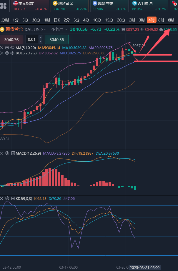 在投资过程中总会有一些外界因素我们必须克服,要耐得住寂寞,经得起诱惑,看得清陷阱,抓得住机会。最终的胜利必将属于我们!以趋势做单,不求单单盈利,只求稳健盈利、稳健给单,制定好做单方案,掌握好趋势抓住每波大行情,获得一个长期稳健的盈利! ————————消息面 周四(3月20日)现货黄金窄幅震荡,目前交投于3040美元/盎司附近。隔夜金价在美联储主席鲍威尔发表讲话后继续冲高,现货黄金一度突破3050美元/盎司大关,创下历史纪录。美联储在最新政策会议上宣布维持利率不变,并暗示今年可能降息两次,同时放缓缩减资产负债表的步伐。这一系列举措引发了美元回吐涨幅、美债收益率下跌,给金价提供上涨动能。 原油