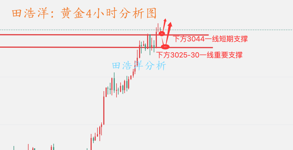美联储凌晨利率决议继续维持现有利率不变,黄金开启了上涨模式,早盘最高触及3056一线回落调整,截止目前最低触及3044附近,我们实盘也是给了3044附近做多,目标先看3053-55一线,如果多头继续冲刺3056并突破的话,往上进一步延伸3060-3070一线,上方可以短空进行尝试一下,主要操作上依旧是回踩顺势做多进行,如果你目前黄金操作不理想,希望田浩洋能让你的投资少走弯路,欢迎前来沟通交流! 从4小时分析来看,下方关注3044-3045一线短期支撑,重点关注3025-30一线重要支撑,回踩依托此位置继续先多看涨不变,上方目标位依旧关注破高,日线级别未跌破下方支撑之前依旧保持顺势主多节奏不变