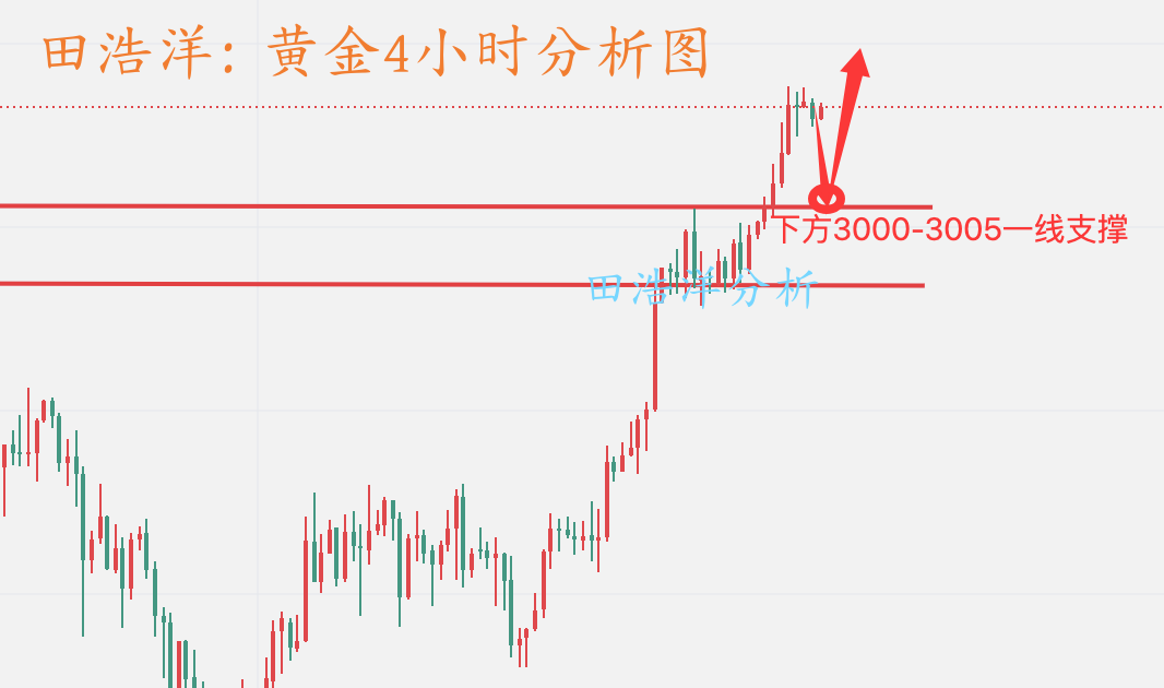黄金今天继续创造新高,最高触及3045一线,下午出现回踩最低触及了我们文章和实盘给的3020-25这个区间内,我们也是给了在此区间做多的策略,多单完美在3036一线获利出局,黄金下午最低触及3023一线后反弹,反弹阳线几乎吞没了下跌的阴线,上方我们继续关注3045-50一线短期压制,响应了我们近期上涨不言顶的口号,做多依旧是大势所趋,周四凌晨两点有美联储决议,大家一定要注意此会议的影响,操作上我们继续保持回踩不破做多,如果你目前黄金操作不理想,希望田浩洋能让你的投资少走弯路,欢迎前来沟通交流! 从4小时分析来看,下方关注3020-3025一线短期支撑,重点关注3000-05一线重要支撑,回踩