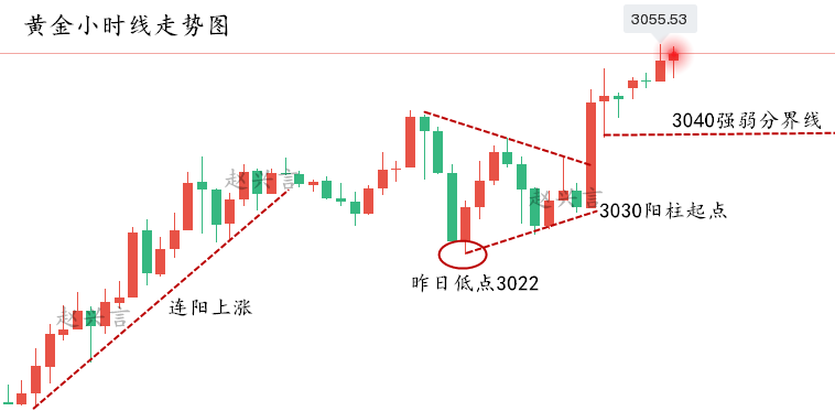 不要让5分钟的不开心影响23小时55分钟的开心。生活中难免会遇到一些不如意的事情,但这些不开心往往是暂时的。如果能以更豁达的心态看待问题,把精力更多地放在积极的方面,就能更好地享受生活,保持内心的平和与快乐。——柳沁雯 >>>>黄金走势解析 国际黄金周二依旧延续多头强势,白盘自3000关口附近连续拉涨上破,截止收盘上部高位已经来到3030上部,企稳3030一线横盘收官,整体行情多头依旧表现强势。 那么对于日线方面的趋势节奏而言,没有太多赘述的点,连续的起阳突破,同时并没有明显的滞涨,无一不印证强势行情的延续,所以还是那句话,这种情况之下一定不要做猜顶的操作,顺势跟随是最为稳健的做法,继续博弈