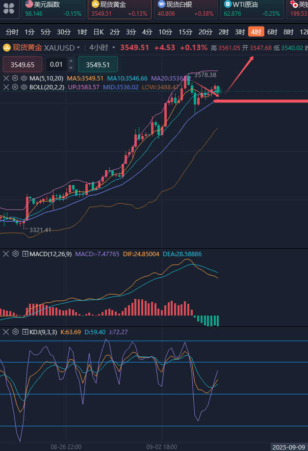 面对市场的波动,恐惧与贪婪是人性的两大弱点。如何克服这些情绪,保持理性思考,是每位投资者必须面对的课题。这要求投资者不仅要掌握投资技巧,更要修炼内心,培养坚韧不拔的意志力和良好的心态。不断提升自我认知,增强心理韧性,确保在投资路上不偏离航道。 ————————消息面 周五(北京时间9月5日)现货黄金震荡微涨,目前交投于3550美元/盎司附近,金价周四下滑,因交易商在创纪录的涨势后获利了结,目前焦点转向美国非农就业报告,以寻找美联储政策路径的新线索;美原油交投于62.8美元/桶附近,油价周四下跌约1%,至两周低点,因上周美国原油库存意外增加,而且市场预期OPEC+产油国将在本周末的会议上提高产