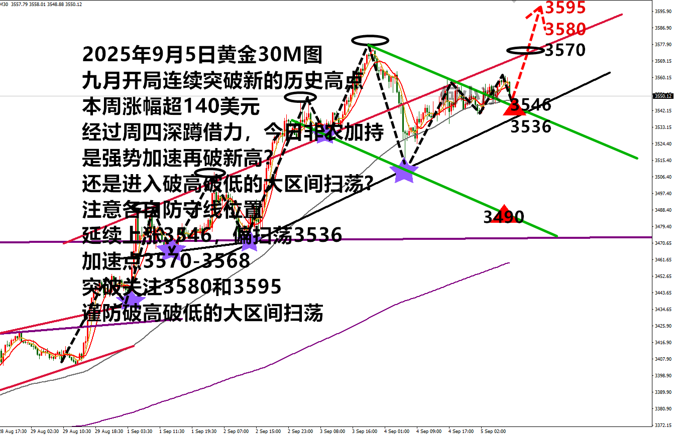 何小冰:非农加东风,金价还是涨涨涨 金价连续突破历史新高后,昨日周四调整了一下,先是急跌超50美元,又稳步上涨收复失地,跌多少涨回多少, 多头的势头仍是非常的强劲 整体节奏上,从4月22日首次冲刺3500区域开始,进入为期四个月的大区间扫荡模式,再到本周9月开局接连突破历史新高,一破再破高点 第一次突破到达3508-3509,深蹲3470确定支撑后拉升破高(深蹲39美元,上涨破高108美元) 第二次突破到达3578区域,深蹲3511确定支撑,现在重新上涨上来3560区域 假设深蹲确定支撑完成,继续拉升看破高,对应的空间幅度:深蹲67美元,往上看冲刺看破高,第一个压力区域3578-3580,扩