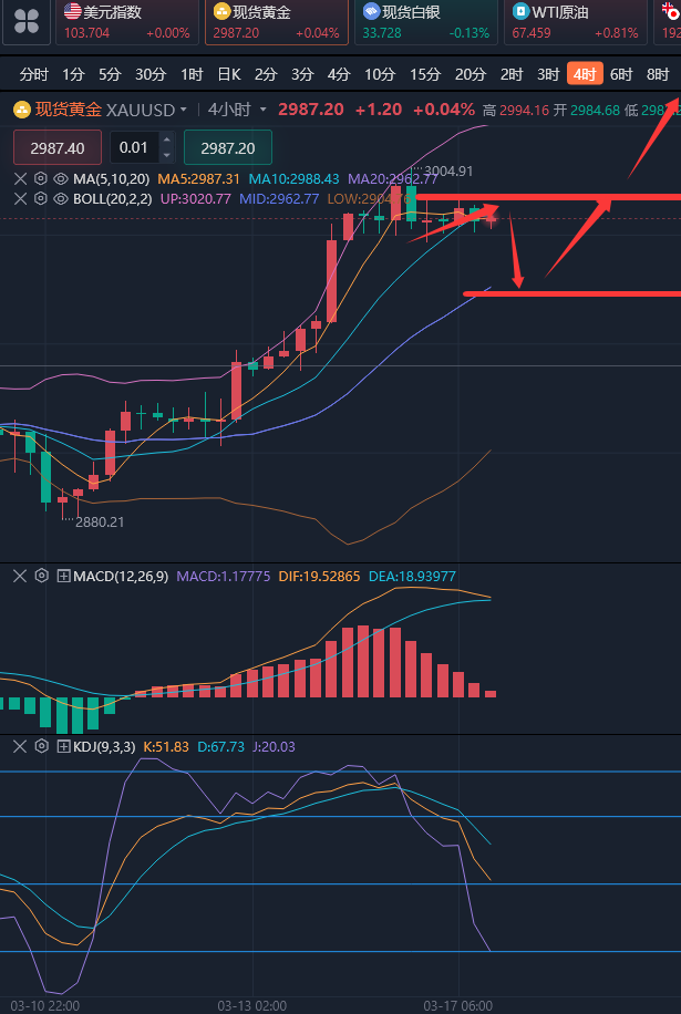 在交易中,最重要的不是赚到了多少钱,最重要的是你能不能学习我这种赚钱的方法,因为赚到钱的人不是你,所以你无法长久依靠。事实上,没有人能够永远依靠一个人,即使这个人是你的父母,是你最亲的人!而投资中,不能光想着依赖别人,师傅请进门修行在个人,一定要学会自己独立分析的能力,有一套自己的交易法则,这样才能在这条路上越走越远! ————————消息面 周一(3月17日)现货黄金高位震荡,目前交投于2988美元/盎司。现货黄金上周五盘中一度突破3000美元重要关口,最高曾触及3004.82美元/盎司,刷新了历史记录高点,投资者追逐避险资产的这轮历史性大涨,寻求规避美国总统特朗普关税战引发的经济不确定性