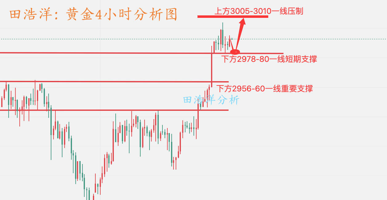 黄金今天周一开盘完美验证了本人周末给的策略分析,周末给出周一开盘2978-80附近多,黄金周一触及2982附近开启了震荡上行模式,我们文章和实盘就给了2978-2985一线附近做多,上方看3000附近,晚间回踩2985我们直接通知了做多,于3000一线通知出局,关注我的朋友和实盘都是可以看到的,黄金现在又是在高位蓄势,不过黄金没有出现过大幅度的调整,黄金小时均线继续金叉向上多头发散,目前没有任何拐头迹象,说明黄金多头力度还在,黄金均线支撑已经上移到2978-83附近,黄金回踩2978-85开始继续做多,如果你目前黄金操作不理想,希望田浩洋能让你的投资少走弯路,欢迎前来沟通交流! 从4小时分析