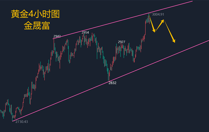 黄金周五一度到达3005附近,那么黄金三千之上还有多少空间?下周黄金又该如何去看? 黄金周五在3000关口冲高回落,晚间震荡收盘日线小十字。对于周五的十字修正,算是对上周黄金大幅上升的调整,下周还有上升空间。 毕竟多头趋势摆在这里:一方面经过前期回调和震荡蓄势,多头积蓄了不少上升动能,价格强势破高2956再创历史新高;另一方面,行情重新回到上升通道之中,相比于前面每一次波幅,这一次在破高以后还有较大上升空间,周初可以期待一下3050这个位置。 对于周一黄金而言,亚盘谨防回调修正有延续,重点关注2976—2965支撑,大概就在这跟支撑线上,回踩看二次上升。时间