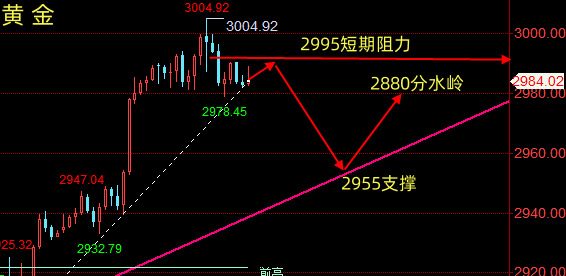 冷静是交易者最高的境界;一不追涨杀跌,控制自己的情绪,控制自己的手,不做情绪的奴隶,静静等待属于自己的模式。二不频繁交易,做自己有确定性的交易,不要贪多。三接受亏损,交易就是概率游戏,承认自己的失误,错了就认错,保持平和心态。 下周黄金分析 本周黄金市场核心驱动来自特朗普关税言论引发的经济政策不确定性导致全球贸易摩擦升温,美股三大指数周内累计跌幅超3%。技术面金价虽然并未一举站稳3000整数大关,但由于向上试探性突破,市场看涨情绪进一步升温,短线预计还将继续尝试冲高以便消化市场多头头寸。 操作建议:周一开盘后2980上方直接进场做多,目标看3000——3010——3020——3030附近 下