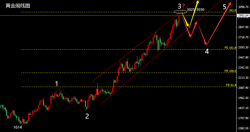 黄金周五一度到达3005附近,那么黄金三千之上还有多少空间?下周黄金又该如何去看? 黄金周五在3000关口冲高回落,晚间震荡收盘日线小十字。对于周五的十字修正,算是对上周黄金大幅上升的调整,下周还有上升空间。 毕竟多头趋势摆在这里:一方面经过前期回调和震荡蓄势,多头积蓄了不少上升动能,价格强势破高2956再创历史新高;另一方面,行情重新回到上升通道之中,相比于前面每一次波幅,这一次在破高以后还有较大上升空间,周初可以期待一下3050这个位置。 对于周一黄金而言,亚盘谨防回调修正有延续,重点关注2976—2965支撑,大概就在这跟支撑线上,回踩看二次上升。时间