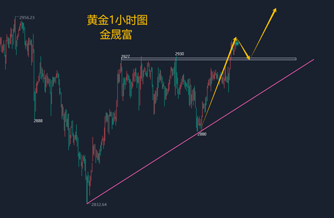 黄金分析: 回顾昨天的黄金形态,我们属于强烈做多看涨,就是看上升和突破。最近震荡中多空飘忽不定,可以说洗盘的手法表现的淋漓尽致。高点频繁的测试,测试越多,那么突破的概率越大。昨天黄金完成向上的突破,还记得为什么去看多吗? 我们强调,黄金在周二形成V型反转走势,日线单阴转阳,完成阴阳循环走势,周初大阴收盘,这里是为了突出收盘价,主力手法很是高深,一定程度上,有追寻空头者,盘中会出现套单的情况。并且说明,周三早盘回落触及2910位置,整体回落无力,跟涨思路明确。凌晨的地点2906位置,这个位置不能有效破位,最终还是依托2906完成向上突破。 今天,周四,日线连阳上升,日内还需要去找寻机会做多,唯