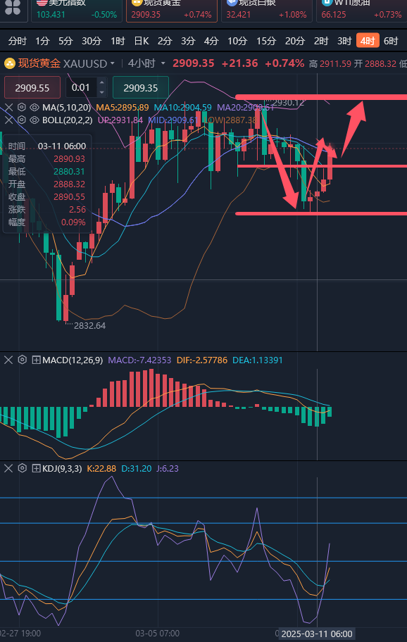 晚间黄金分析策略: 周二(3月11日)欧市早盘,现货黄金维持日内反弹走势,现在所有的目光都转向美国经济数据的发布,以寻求新的交易动力,JOLTS职位空缺数据将于周二晚些时候公布,而关键的消费者物价指数(CPI)报告将于周三公布。周二凌晨黄金价格跌破2891支撑节点后触及2880一线,早盘再次回撤2880筑底反弹,那么4小时K线中2880位置就可以当做是今天的小双底对待,至于阻力就看昨夜美盘反弹高点2910位置,这是目前的温和震荡箱体,后续行情破位再做调整。晚间大概率会在2920-2890区间震荡。个人建议:高空低多为主;GOLD分水岭:2910美元/盎司 晚间黄金交易策略: 空单计划:292