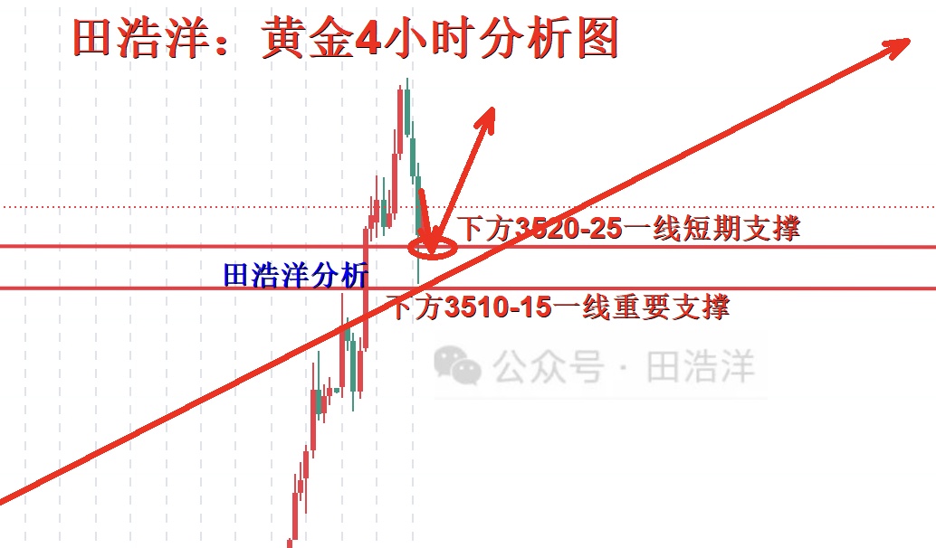 黄金自今日凌晨最高触及3578一线后就开始进行了技术面的调整,开盘后黄金震荡下行,然后突然空头发力向下拉扯,最低触及3511一线后赶紧反弹,瞬间让大家看多的目光一下子凝固了,虽然我们在3530一线做多被止损了,但是丝毫不影响本人田浩洋的看多思路,我们继续在3510-15一线看多,行情回调并不等于行情反转,所以我们坚持黄金回踩做多的思路进行,多头依旧是目前的主要趋势。如果你目前操作不理想,希望田浩洋能让你的投资少走弯路,欢迎前来沟通交流! 从目前黄金走势来看,下方支撑关注3520-25一线短期支撑,重点关注早间回调位置3510-15一线重要支撑情况,3500一线是多头的最后防线,回踩依托此位置