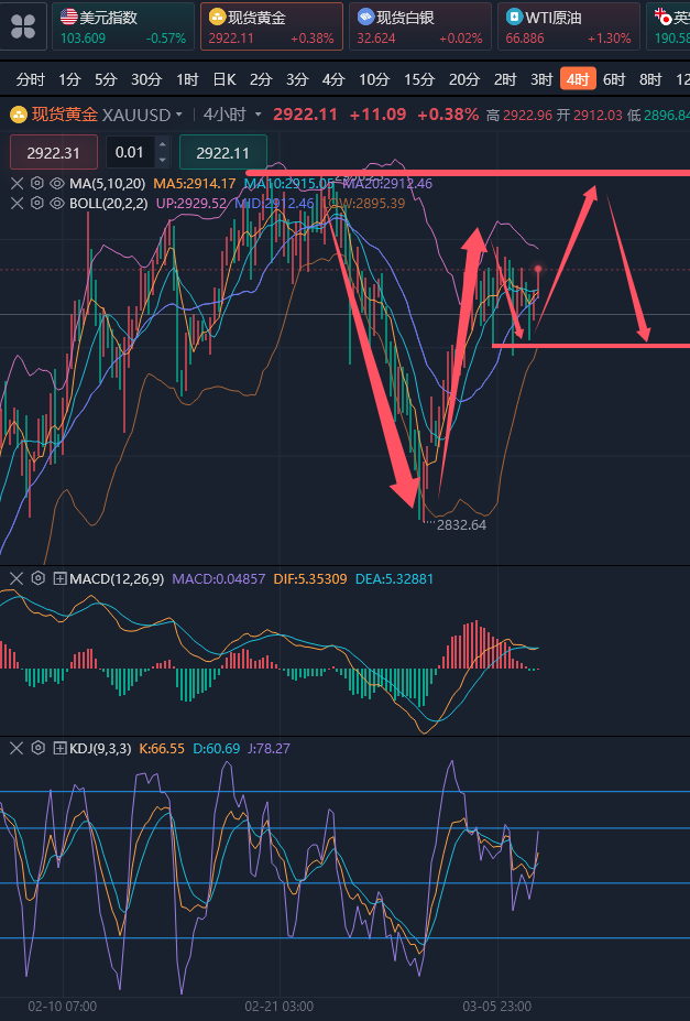 交易市场充满机会和挑战,就像生活一样,在波动的时刻坚守冷静和纪律。不要忘记风险管理的重要性,每次交易都是一次学习的机会,无论成功还是失败都在积累经验,保持豁达和开放的心态欣赏市场沿途风景 ————————消息面 周五(3月7日)现货黄金震荡上涨,目前交投于2922美元/盎司附近。金价周四小幅下跌,特朗普的一些关税豁免政策,市场憧憬俄乌战争接近尾声,令避险情绪有所降温,推动部分多头获利了结,现货黄金一度跌至2891美元/盎司附近,但美国国1月贸易逆差创下纪录新高,这暗示贸易可能给第一季度经济增长造成拖累,市场对美联储5月份降息预期升温,吸引逢低买盘支撑金价,现货黄金周四收报2910.76美元/