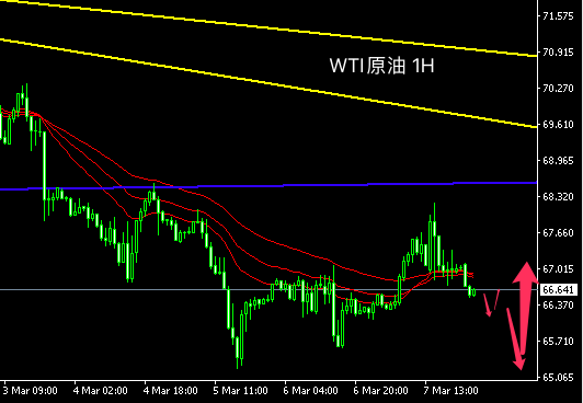 由于交易员担心美国、加拿大和中国之间的关税影响以及 OPEC+ 提高产量的计划,WTI 价格仍处于三年低点附近守势。 原油从日线图级别看,中期走势保持在宽幅上行通道内运行,油价逐步回落至通道下沿。多次出现一个交易日吞没周内前期全部涨幅的现象,空头势力更占优势。原油中期走势维持区间震荡下行,通道下沿已被跌破,预计原油中期跌势即将开启。 原油短线(1H)走势维持低位盘整,油价上下穿越均线系统,短线客观趋势方向横盘震荡节奏。底部震荡的区间波幅被扩大,区间在68.50-65.20之间。预计日内原油走势在此区间内运行为主。 今日:68.10做空,止损:68.80,目标65.60。 免责声明:观点分享,